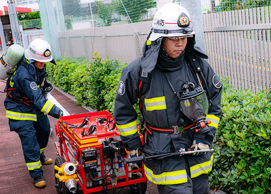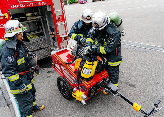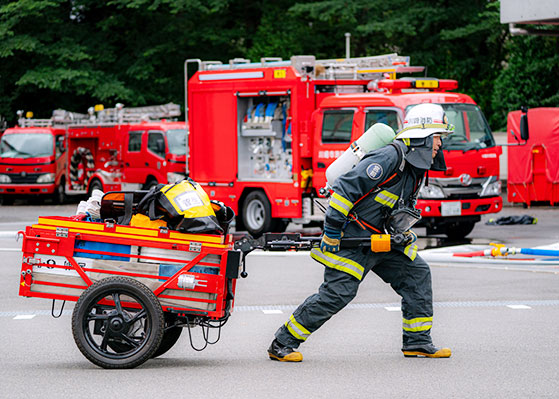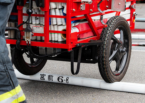 比較検討を推し進めた施設装備課・山岸さんによると「箱型と加納式とそれぞれに一長一短ありますが、扱いやすさからX-QUICKERを選択。また、実際に使用した隊員からは『消防車から降ろして曳くだけと初動が早い』『ハンドル部分が長く、荷室と足下の間が広いので、前傾姿勢が取りやすく曳きやすい』『グッと前に踏み込むだけでアシストが自然に働き、走り出しがスムーズ』『ホースカーの上に他の資機材をたくさん積載してもアシストが効いて重さを感じない』などの声が寄せられている」そうで、「X-QUICKER」の操作性の高さが、早急に現着し、消火活動を開始したい隊員のみなさんの気持ちに応えているようです。